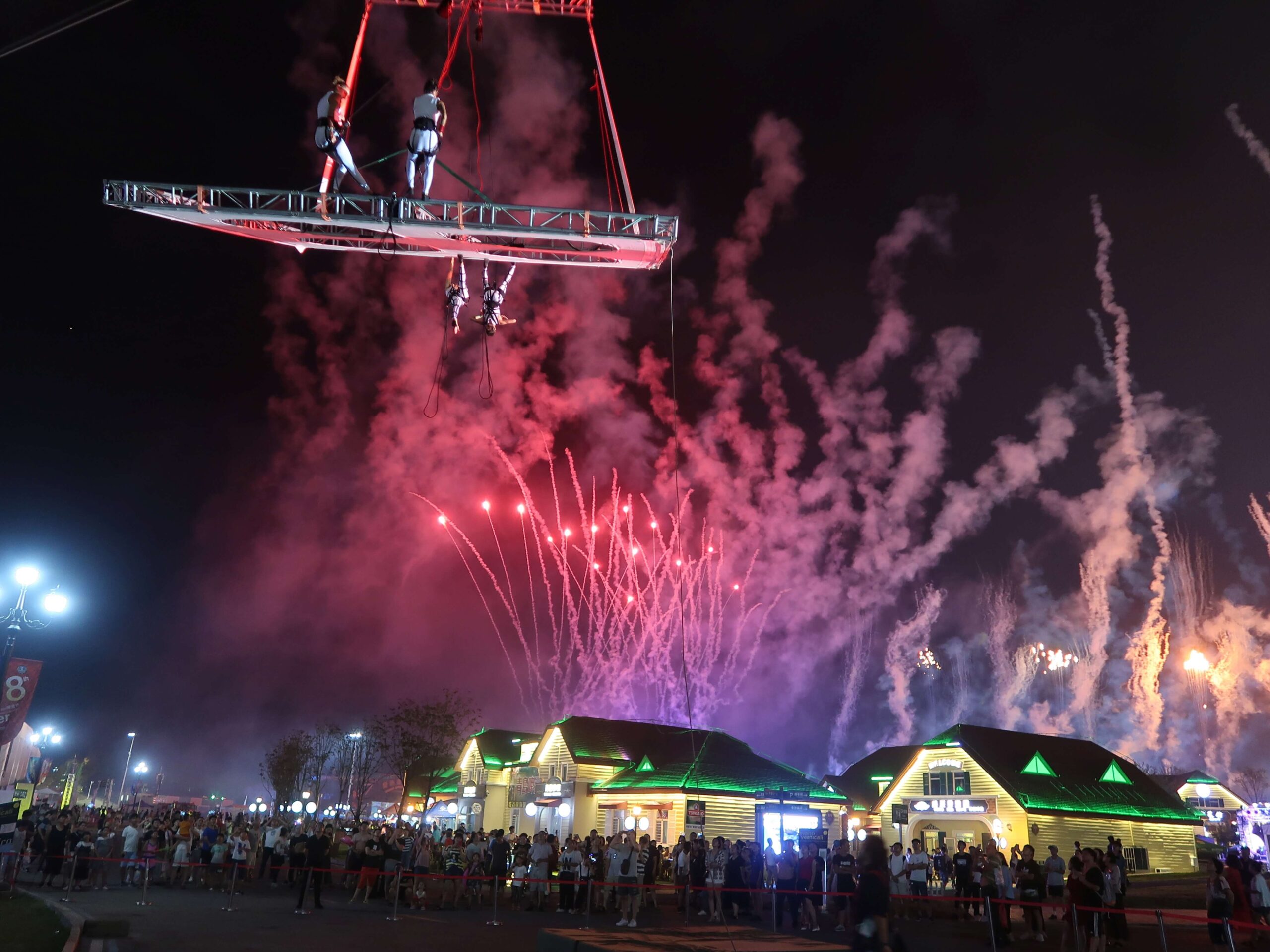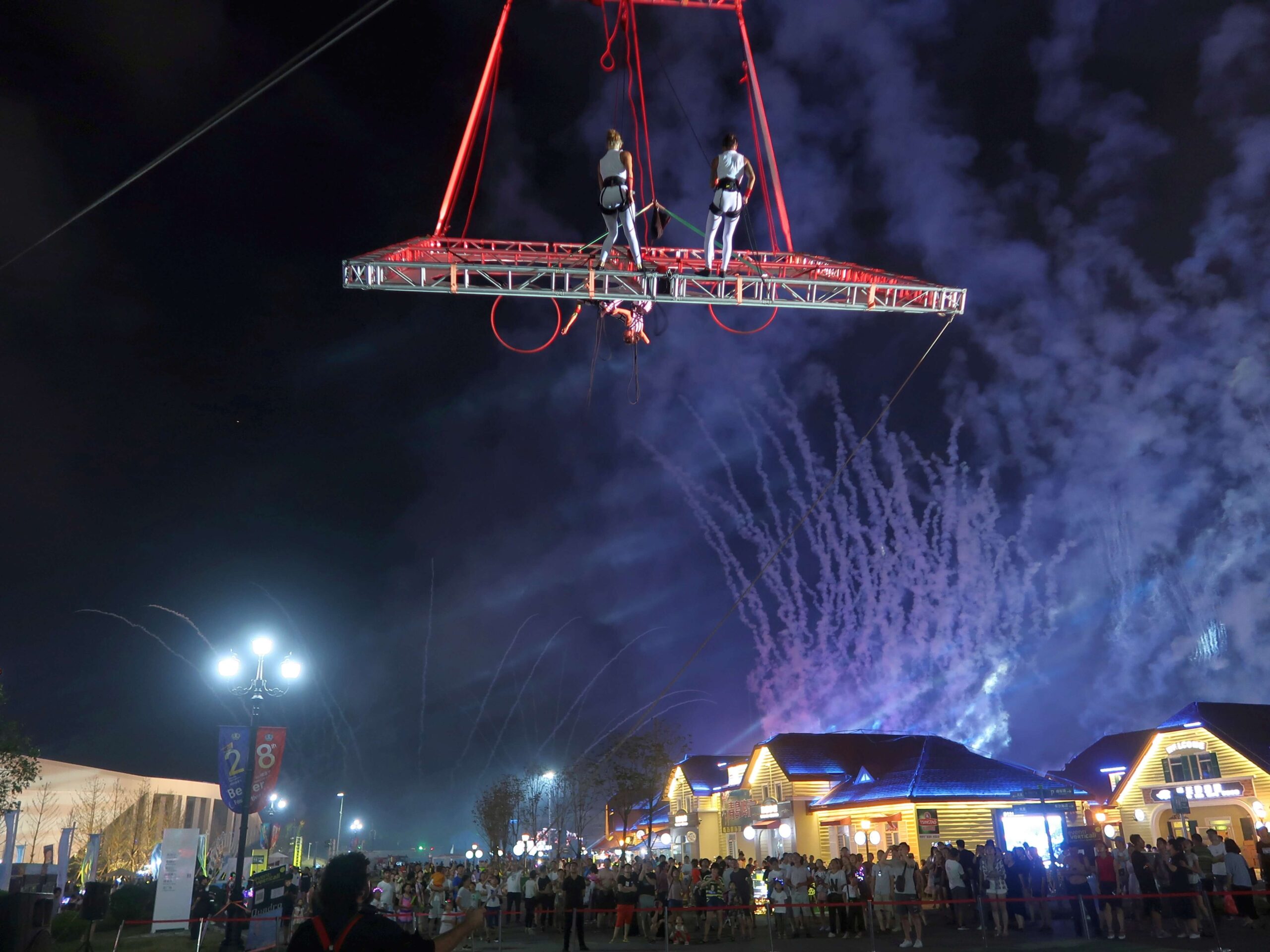 A 50-square-meter aerial stage, with 4 large holes acting as wings, appears to the audience as a horizontal plane that slowly moves mutating into a wall.